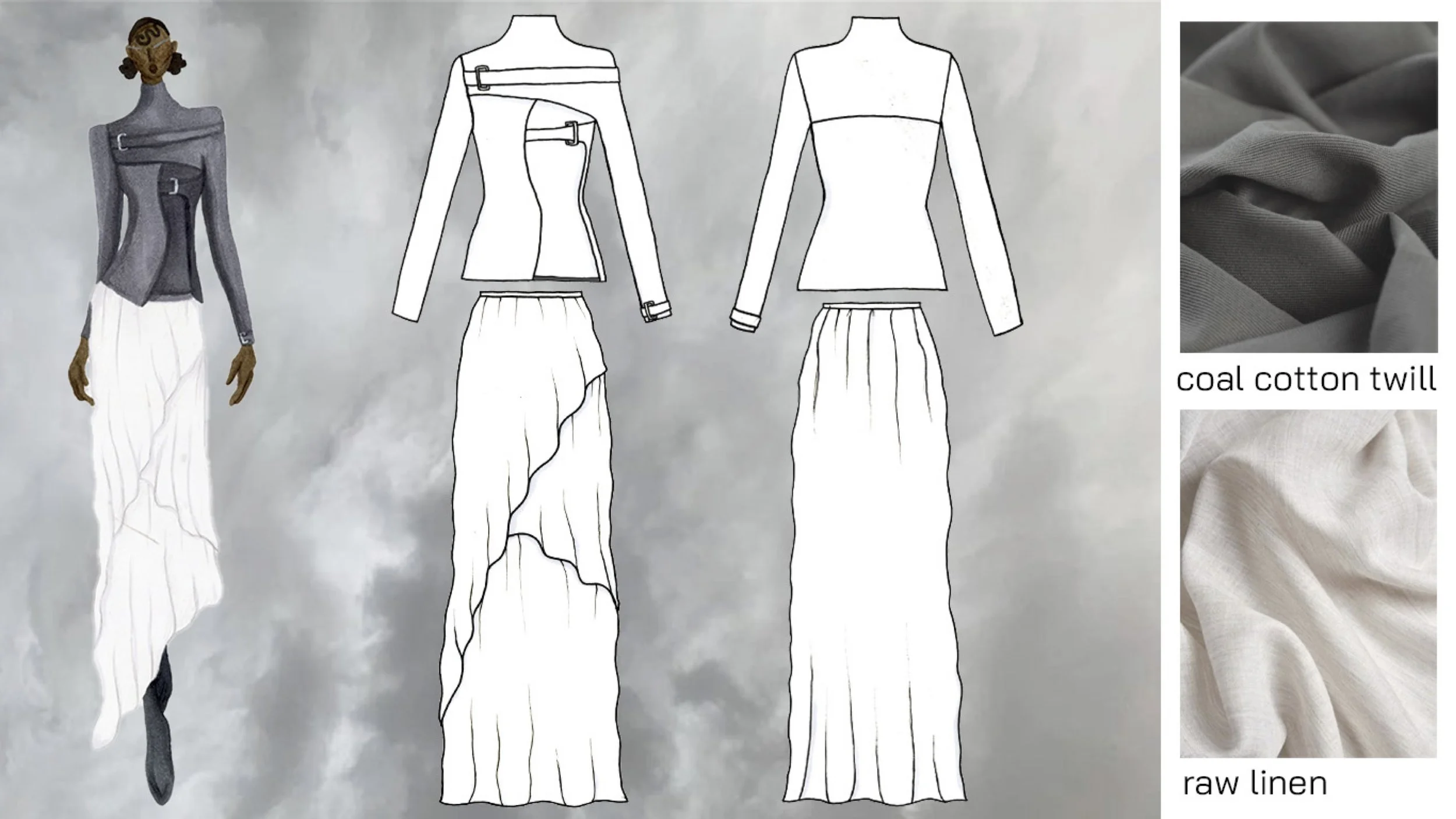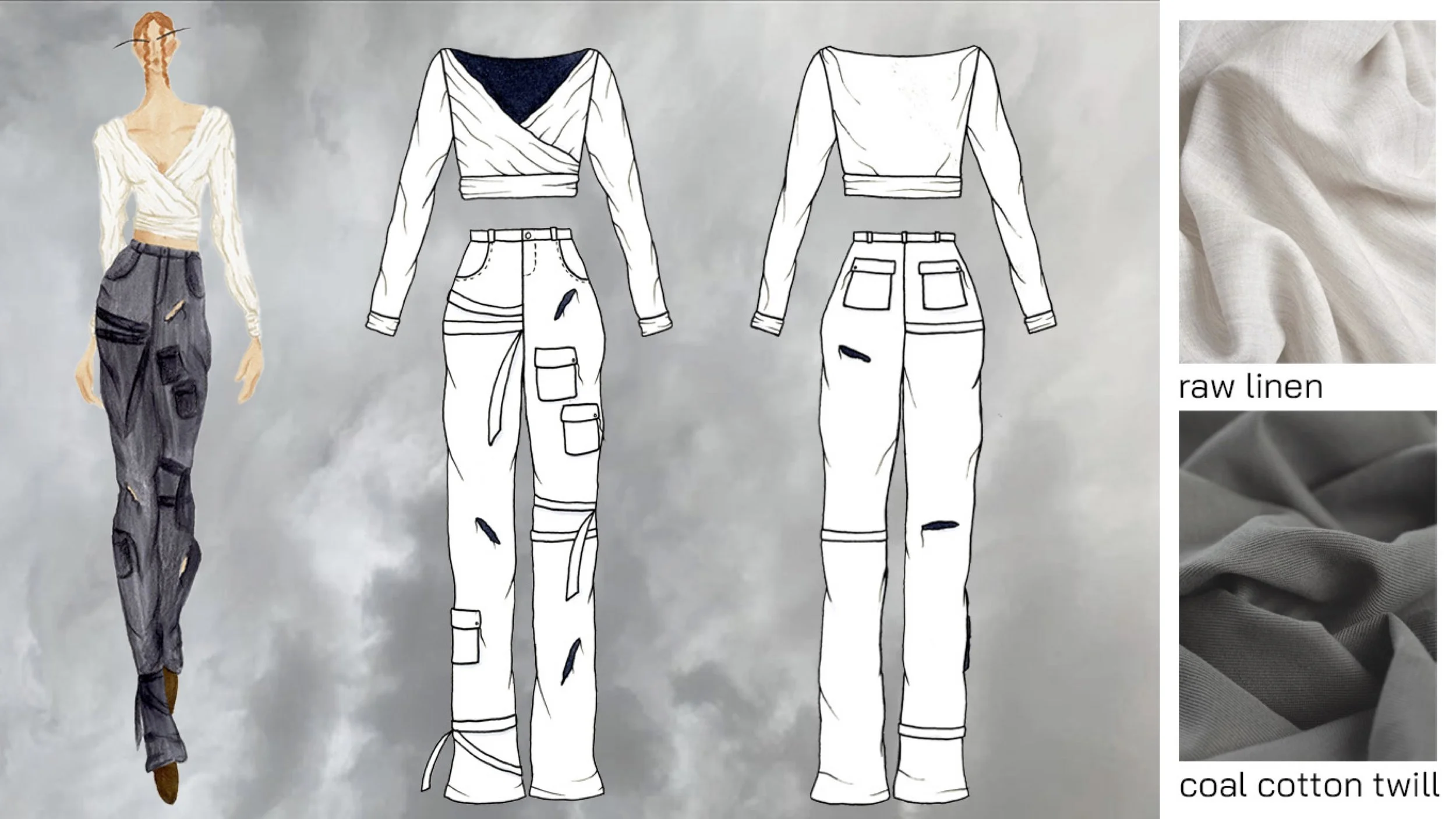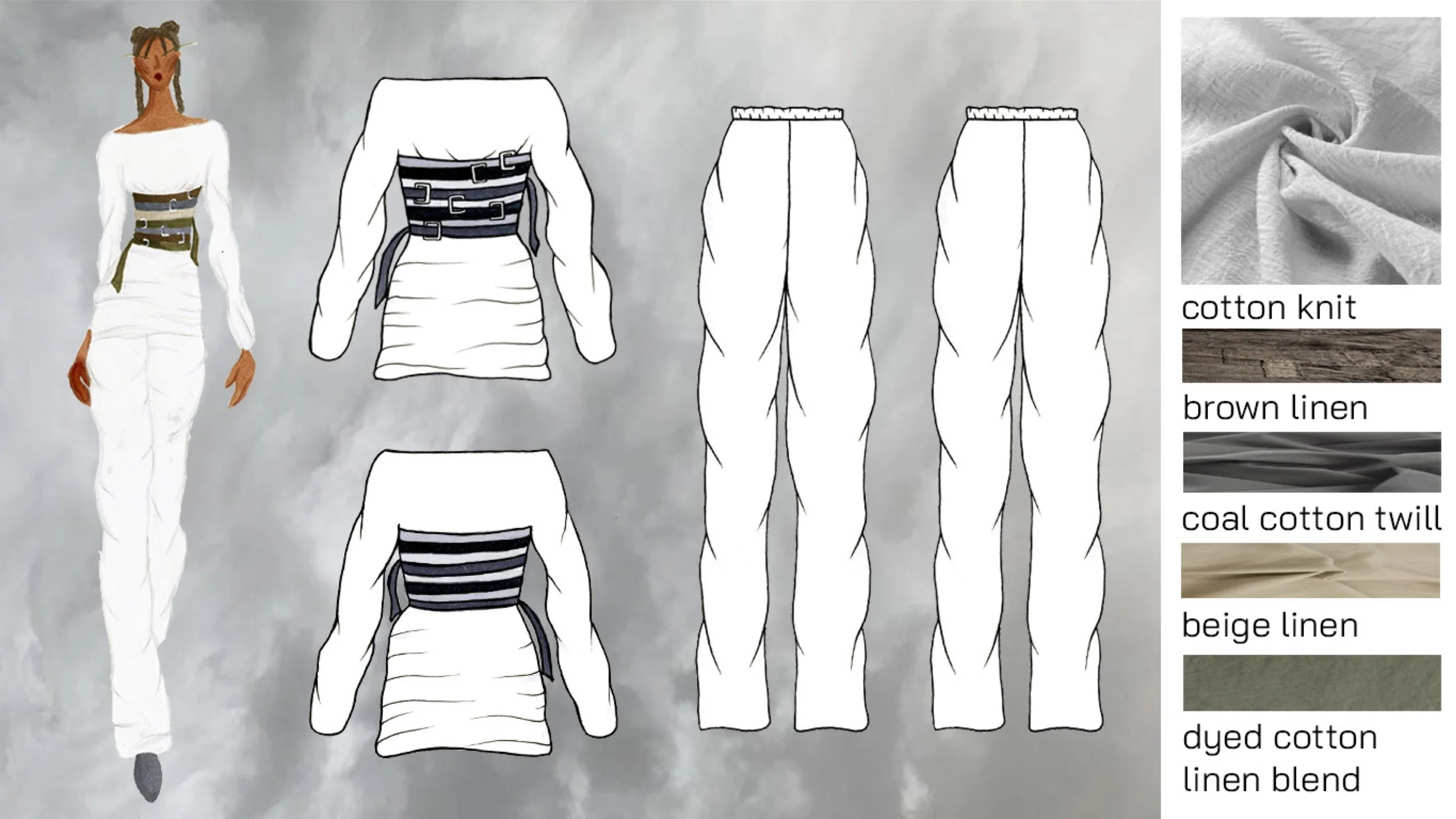 Inspired by sustainability and the natural world, I chose to title my collection “Biophilia.” Biophilia can be defined as the hypothetical human tendency to seek connections with nature and other forms of life. In my futuristic world, this world is not a hypothetical. After humans wiped the world of its natural resources and destroyed humanity, a new generation has emerged from the ashes. After seeing what mankind has done to their home, this new generation has discovered their innate love for all living forms. As nature regrows itself into the desolate earth, humans work to be a part of the natural world. My collection emphasizes natural materials, such as zero-waste knits and naturally dyed linens. In regard to silhouettes, I wanted the pieces to mimic the natural world to the best of my ability. Lastly, I wanted this collection to have a softness and calmness that reflects the loving and positive relationship between humans and nature. With that, I present to you “Biophilia.”